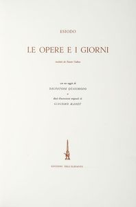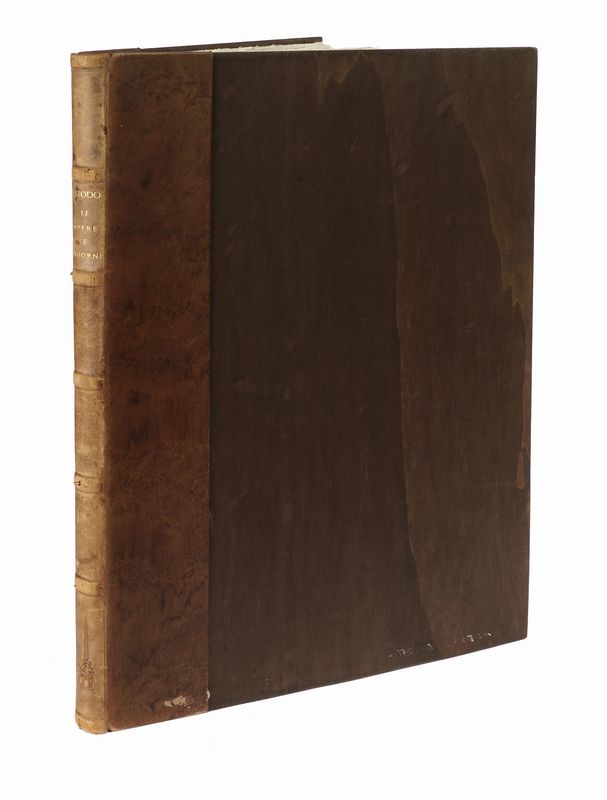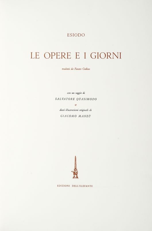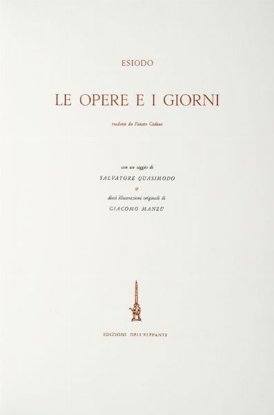 In-folio (mm 530x360). Ottimo esemplare in barbe, con 10 belle tavole di Giacomo Manzù, a piena pagina nel testo. Legatura coeva in mezza pelle, con piatti in legno e titoli in oro al dorso a 5 nervi. Dorso lievemente spellato, altrimenti buone condizioni. Entro custodia in pieno cartonato marmorizzato, con difetti e mancanze. Esemplare 248/999.