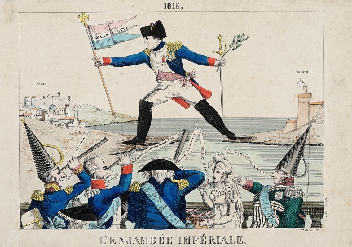Xilografia a colori. mm 392x550. Foglio: mm 418x640. Dalle Battaglie Napoleoniche (Imagerie d’Epinal), serie di 22 xilografie a colori eseguite tra il 1830 e il 1840 da François Georgin (1801-1863), il cui nome si legge sulla matrice in basso a destra. Animatissima e coloratissima scena in cui si vede Napoleone Bonaparte, appena sbarcato nel Golfe Juan, vicino ad Antibes, con gli uomini della sua guardia, che viene trionfalmente accolto dalla popolazione del luogo. SI AGGIUNGE: Felix Fleury (disegnatore). L’Enjambée Impériale. 1867 ca. Litografia in coloritura. mm 215x270. Da caricatura originale opera di anonimo pubblicata nel 1815. Vi sono raffigurate le autorità parigine in allarme per il ritorno di Napoleone.