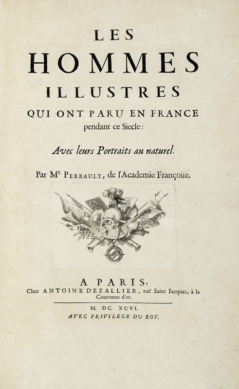 2 tomi in 1 volume in-folio (mm 433x280). Con 1 ritratto dell'Autore, 1 antiporta allegorica raffigurante la statua equestre di Luigi XIV incisa da Gérard Edelinck e, complessivamente, 100 (di 102, secondo OPAC) tavole di ritratti; il tutto inciso in rame, fuori testo. Frontespizio con vignetta alle armi incisa in rame da Sébastien Le Clerc, ripresa alla fine del primo volume, testatine e capilettera xilografici nel testo. Esemplare perfettamente conservato, con rare e lievi bruniture ad alcune carte. Legatura in piena pelle, con fregi e titoli in oro su tassello al dorso a 7 nervi. Tagli marmorizzati con dentelles dorate alle unghiature. Lievi abrasioni alle cerniere e punte stanche.
