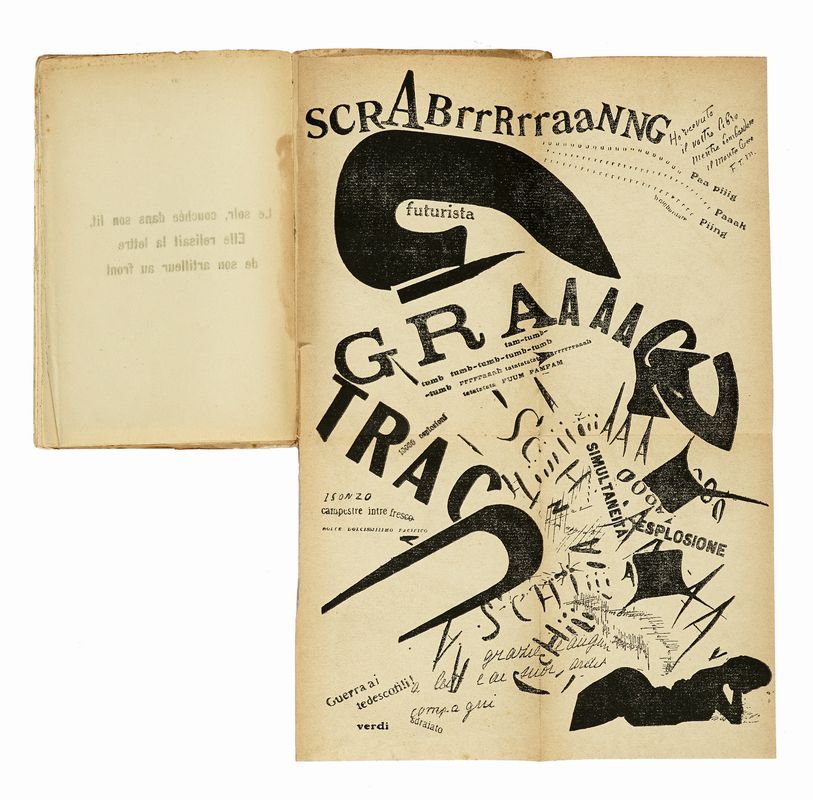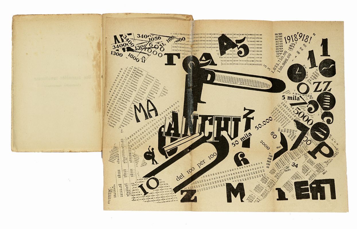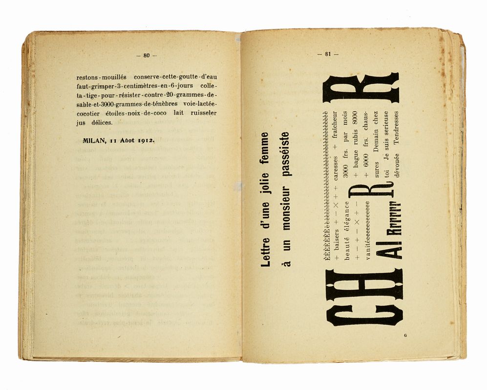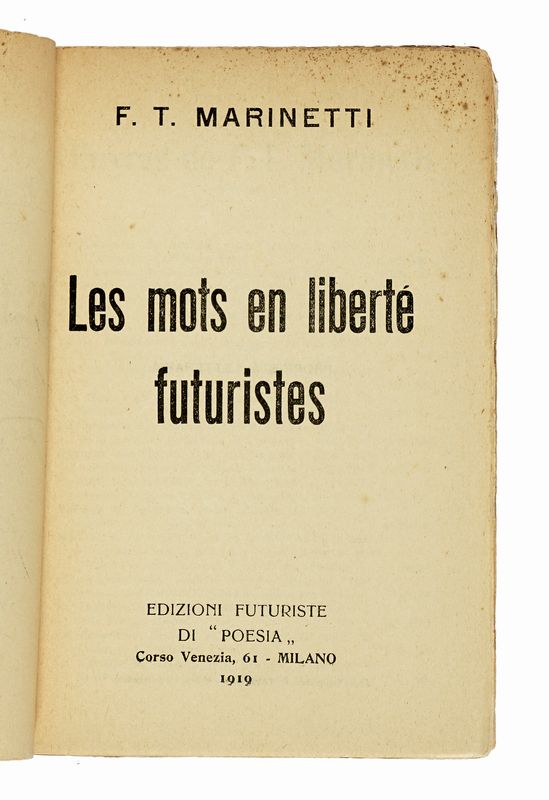 In-8° (mm 191x127). Pagine [6], 9-95, [1], 99, [1], 103, [1], 107, [1]. Con 4 tavole parolibere fuori testo, più volte ripiegate. Numerose poesie parolibere nel testo. Un rinforzo al margine interno di pagina 99, della tavola Bataille à 9 Étages (la quale presenta anche un piccolo foro restaurato) e della tavola Après la Marne (parzialmente incollata); segni di incollaggio anche tra la tavola Le soir e pagina 107, e uno strappo maldestramente restaurato con nastro adesivo alla tavola Une assemblée tumultueuse. Brossura editoriale con una composizione parolibera in nero e rosso al piatto anteriore. Lievi bruniture uniformi e fioriture ai piatti, dorso ricostruito, ma nel complesso buone condizioni di conservazione. Con una dedica autografa di Marinetti al foglio di guardia anteriore, datata 1931.