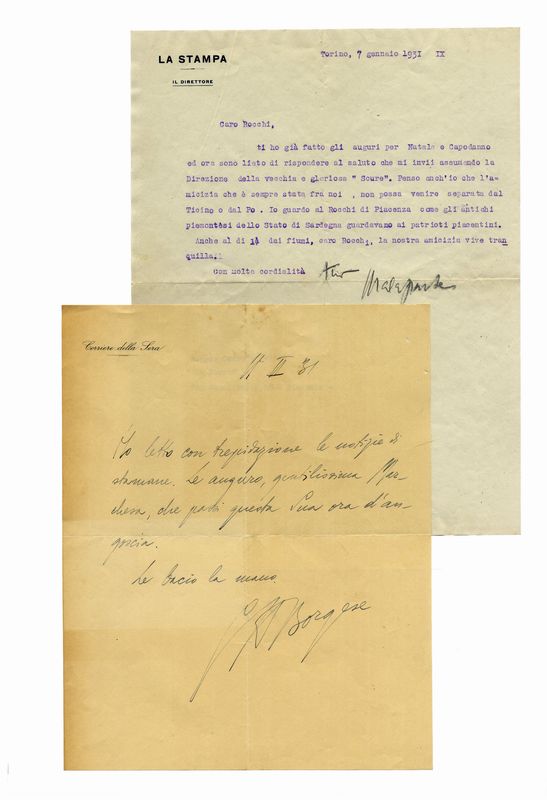 Dattiloscritto a inchiostro blu. Firma a inchiostro nero. Su carta intestata “La Stampa / Il Direttore”. Dimensioni: 280x210 mm. SI AGGIUNGE: Giuseppe Antonio Borgese. Lettera autografa firmata su carta intestata “Corriere della Sera”. Datata 1931. SI AGGIUNGE: Luigi Sturzo. Lettera dattiloscritta con firma autografa. Datata 5 gennaio 1923.