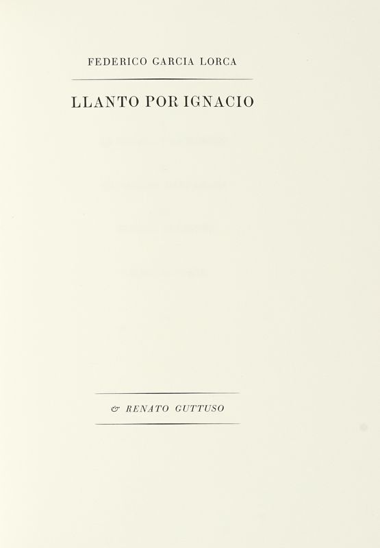 In-folio (mm 350x240). Con un’acquaforte a doppia pagina fuori testo, numerata e firmata a matita da Guttuso. Brossura editoriale con titoli al piatto anteriore; camicia e custodia in cartonato color mattone, con titolo in argento al dorso. Uno dei 150 esemplari numerati. SI AGGIUNGE: Messina Francesco, Ilaria e altre poesie. Prefazione di Giovanni Papini. Milano: All'Insegna del Pesce d'Oro, 1962. In-4° (mm 335x230). Una delle 100 copie di lusso, numerate da I a C, con una litografia originale, numerata e firmata da Francesco Messina sciolta, fuori testo. SI AGGIUNGE: Mallarmé Stéphane, L'après-midi d'une faune. Il meriggio di un fauno. [...] Due incisioni di Virgilio Guidi. Ancona: Bucciarelli, 1963. In-4° (mm 360x255). Con due incisioni di Virgilio Guidi nel testo, numerati e firmati a matita. SI AGGIUNGE: Foscolo Ugo, Dei sepolcri. Verona: Editiones Dominicae, 1966. In-folio piccolo (mm 370x270). Con due litografie di Achille Funi, firmate a matita. Tiratura in 150 esemplari numerati.