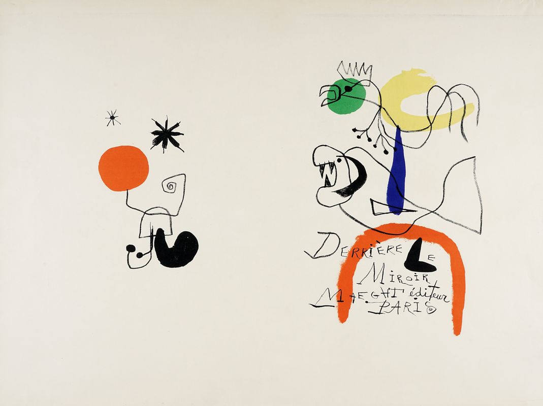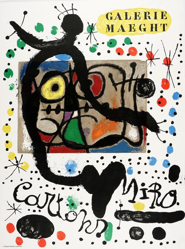 1) Galerie Maeght. Miró. Artigas. Céramiques monumentales. Manifesto litografico originale (mm 670x500) della mostra di Miró e Artigas del 1963 presso la Galleria Marght; 2) Galerie Maeght. Miró. Cartons. Manifesto litografico originale (mm 652x486) della mostra di Miró del 1965; 3) Galerie Maeght. L'oiseau solaire, l'oiseau lunaire, etincelles. Manifesto litografico originale (mm 645X475) della mostra di Miró del 1967; 4) Derriere le Miroir Maeght Editeur Paris. Poster litografico (mm 570x763) del 1954. Alcune opere presentano strappetti o altri minimi difetti marginali, ma nel complesso si presetano in ottime condizioni.