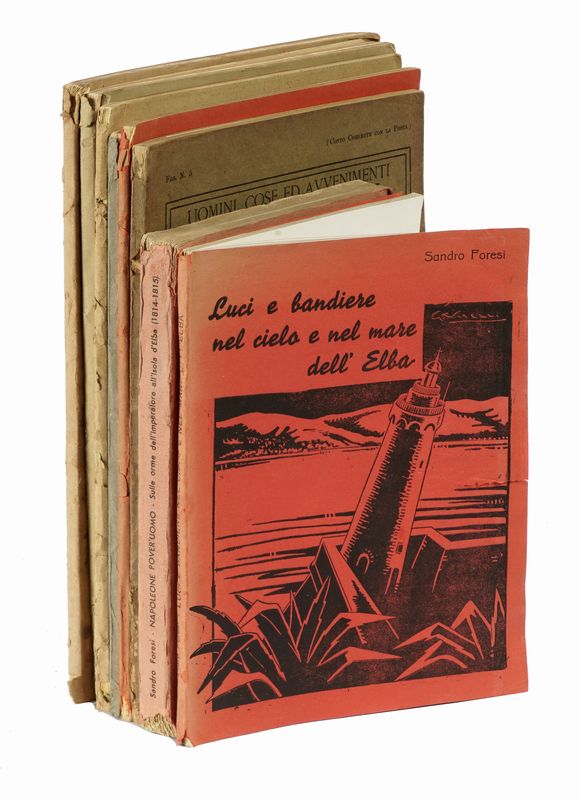 Compongono il lotto: 1) Foresi Sandro, Luci e bandiere nel cielo e nel mare dell’Elba. Portoferraio: Tipogr. Popolare, 1938; 2) Id., Napoleone pover’uomo. Sulle orme dell’Imperatore all’Isola d’Elba (1814-1815). Portoferraio: Tipogr. Popolare, 1938; 3) Id., Pagine di splendore e di erudizione sull’Isola d’Elba (con numerose notizie statistiche ed illustrazioni). Portoferraio: Tip. Popolare, 1932. 4) Id., Elba, isola bella! Raccolta di scritti, di notizie, di illustrazioni. Portoferraio: Tip. Popolare, 1931. Elenco completo disponibile su rischiesta. Lotto non passibile di restituzione.