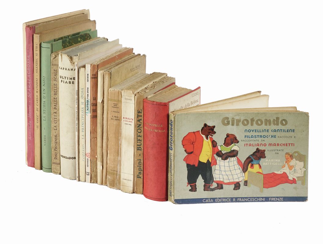 Compongono il lotto: 1) Munari Bruno, Rose nell'insalata. Illustrazioni dell'Autore. Torino: Einaudi, 1982; 2) Valeri Franca, Il diario della signorina snob. Illustrato da Colette Rosselli. S.l.: Mondadori, 1951; 3) Palazzeschi Aldo, Il palio dei buffi. Novelle. Firenze: Vallecchi, 1937; 4) Vamba [pseud. di Bertelli Luigi], La storia d'un naso... Firenze: Bemporad, 1923; 5) Gozzano Guido, La principessa si sposa. Le dolci rime... Milano: Garzanti, 1944; 6) Capuana Luigi, Le Ultime Fiabe. S.l.: Mondadori, 1932. Elenco completo disponibile su richiesta. Lotto non passibile di restituzione.
