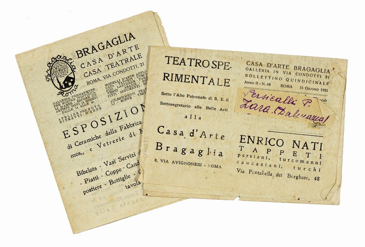 1) Bragaglia, casa d'arte casa teatrale. Esposizione di Ceramiche Keramos e Vetrerie di Murano; 2) Bragaglia, casa d'arte casa teatrale. 74° Esposizione Disegni di Emmanuel. 1921. 2 cataloghi in-16° (mm 152x120 ca.) in brossura editoriale delle mostre svoltesi presso la galleria della Casa d'Arte e Casa Teatrale Bragaglia di via Condotti di Roma nel 1921. Lievi fioriture e strappetti marginali, ma nel complesso buono stato di conservazione.