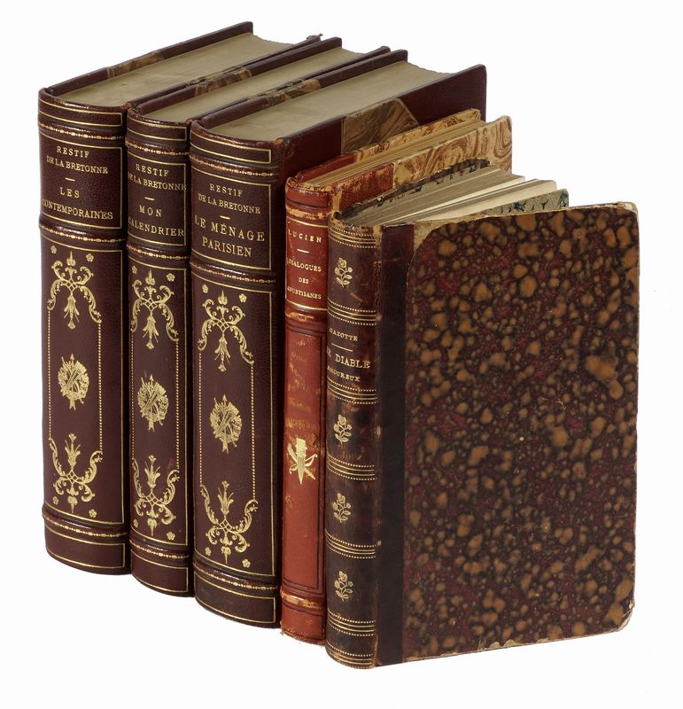 Compongono il lotto: 1) Boccaccio Giovanni, Les Contes de Boccace. Decameron traduit de l'italien par Antoine Le Macon. Les Cinq Premières (- Dernières) Journées. Illustrations de Brunelleschi. Paris, Gibert Jeune Librairie d'Amateurs, 1934; 2) La Fontaine Jean (de), Contes et nouvelles [...]. Illustrations en couleurs de Brunelleschi. Premier (-cinquième) livres. Paris: Gibert Jeune, 1940-41; 3) Sappho, Poésies [...] suivies des odes d'anacréon et des anacréontiques [...] avec des illustrations de Sylvain Sauvage. Paris: Les editions Emile Chamontin, 1941; 4) De Musset Alfred, Les deux maitresses... Paris: èditions de la Pléiade, 1928; 5) Goncourt Edmond (de), La fille élisa. Illustrations de Paul-Louis Guilbert. Paris: Georges Briffaut, 1929. Elenco completo disponibile su richiesta. Lotto non passibile di restituzione.