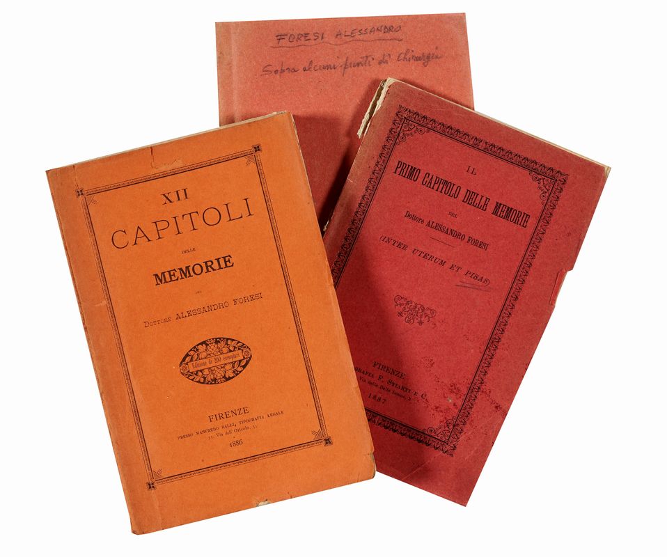 Compongono il lotto: 1) Foresi Alessandro, Sopra alcuni punti di chirurgia discussi nella terza riunione degli scienziati italiani in Firenze. Lettera. Firenze: Tip. Mazzoni, 1841; 2) Id., XII capitoli delle Memorie. Firenze: presso Manfredo Balli, 1886; 3) Id., Il primo capitolo delle Memorie. Firenze: Tip. Stianti, 1887.