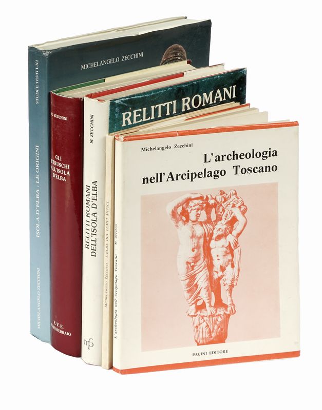 Compongono il lotto: 1) Zecchini Michelangelo, L’Elba dei tempi mitici. Con appendice: guida all’Antiquarium archeologico di Marciana. Pisa: Pacini Mariotti, 1970; 2) Id., L’archeologia nell’Arcipelago Toscano. Pisa: Pacini, 1971; 3) Id., Gli Etruschi all’Isola d’Elba. Portoferraio: Ente Valorizzazione Elba, 1978; 4) Id., Isola d’Elba: le origini. Lucca: Edizioni S. Marco Litotipo, 2001; 5) Id., Relitti romani dell’Isola d’Elba. Lucca: M. Pacini Fazzi, 1982.