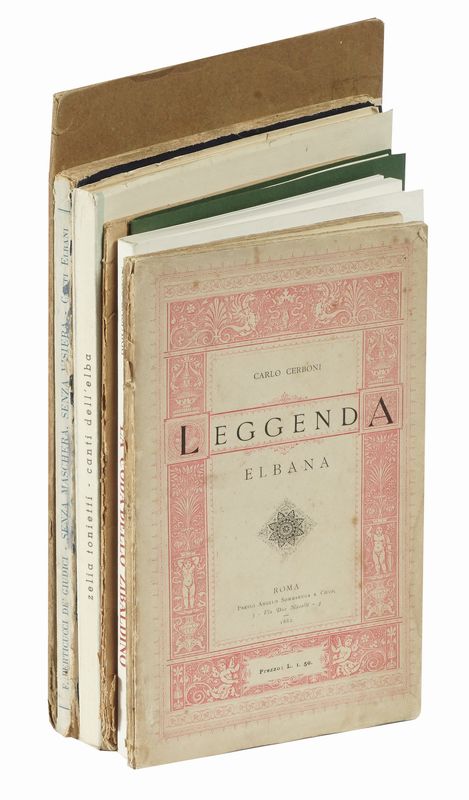 Compongono il lotto: 1) L'Ape Elbana. Strenna popolare. Anno I. Portoferraio: Tip. A. Dionigi, 1859; 2) Castelli Lorenzo, I pregi dell’isola dell’Elba. Componimenti illustrati da note. Firenze: Stamperia del Giglio, 1829; 3) Cerboni Carlo, Leggenda elbana. Roma: Sommaruga, 1882; 4) Sonetti musihali in vernaholo Portoferaiese. Pisa: Dolovio Disperati, 1969. Elenco completo disponibile su richiesta.