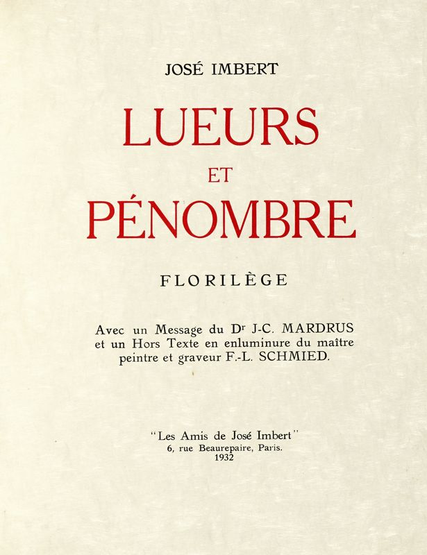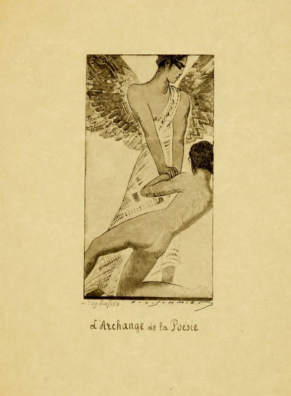 In-8° (mm 255x194). Pagine 117, [11]. Con, sciolta, una splendida incisione di François-Louis Schmied fuori testo, ritoccata a mano, numerata a matita e firmata in lastra, intitolata L'Archange de la Poésie, e da una prova in nero della stessa opera, numerata bis a matita e firmata in lastra. Bell'esemplare a bifoli sciolti, stampato su Japon nacré, e perfettamente conservato. Brossura editoriale con sovraccoperta con titoli in nero e rosso al piatto anteriore; camicia e cofanetto in mezza tela viola, con titoli su tassello di carta al dorso. Lievi scoloriture e abrasioni agli angoli, altrimenti buono stato di conservazione. Uno dei 50 esemplari in commercio, su una tiratura complessiva di 150 copie.