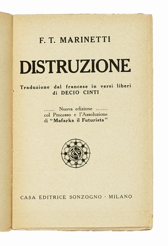 In-16° (mm 186x118). Pagine 298, [6]. Alcune carte in principio allentate, per il resto perfetto stato. Brossura editoriale originale arancione con titoli impressi in nero a piatti e dorso. Timbro di precedente proprietario alla carta di occhietto. SI AGGIUNGE: Id., Distruzione. Poema futurista. Nuova edizione col Processo e l'Assoluzione di Mafarka il futurista. Milano: casa editrice Sonzogno, s.d. In-16° (mm 185x118). Brossura editoriale originale impressa in blu e rosso. Titolo a dorso e piatti. Macchiato il dorso, minime mancanze alla cuffia inferiore.