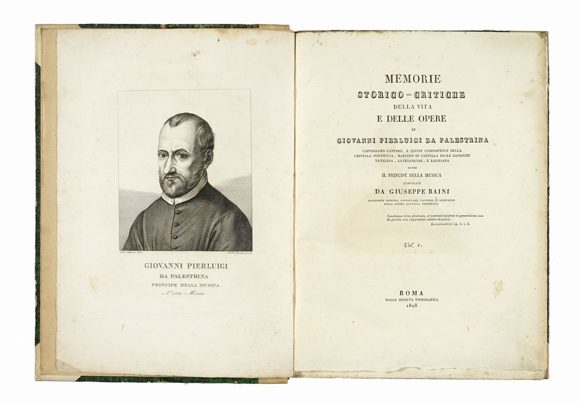 2 volumi in-folio (mm 310x225). Con un ritratto di Giovanni Pieluigi da Palestrina in antiporta al primo volume. Legatura coeva in mezza pergamena rigida con punte e piatti in carta decorata. Titoli in oro su tassello al dorso. Conservato il piatto anteriore della brossura, sciolto, nel primo volume.