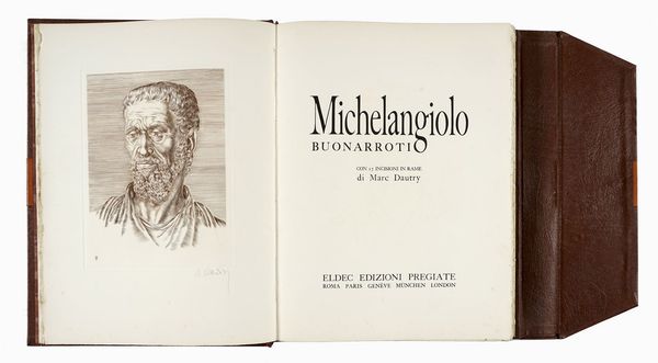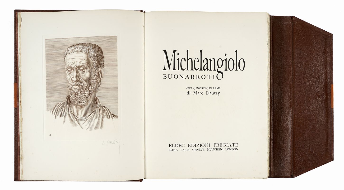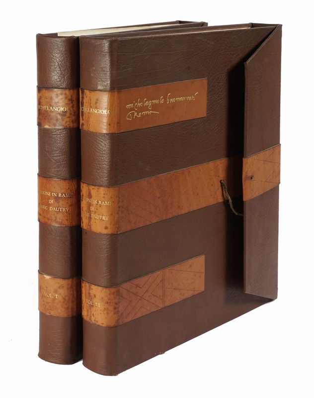 2 volumi in-folio (mm 430x320). Contiene incisioni fuori testo firmate a matita da Marc Dautry. Alcune incisioni risultano sciole, per il resto ottimo stato conservativo. Legatura originale a busta in piena pelle con bande e titolo impresso in oro a piatto anteriore e dorso. Sguardie con riproduzione di manoscritto. Rotto il laccetto di pelle al secondo volume, altrimenti ottima conservazione.