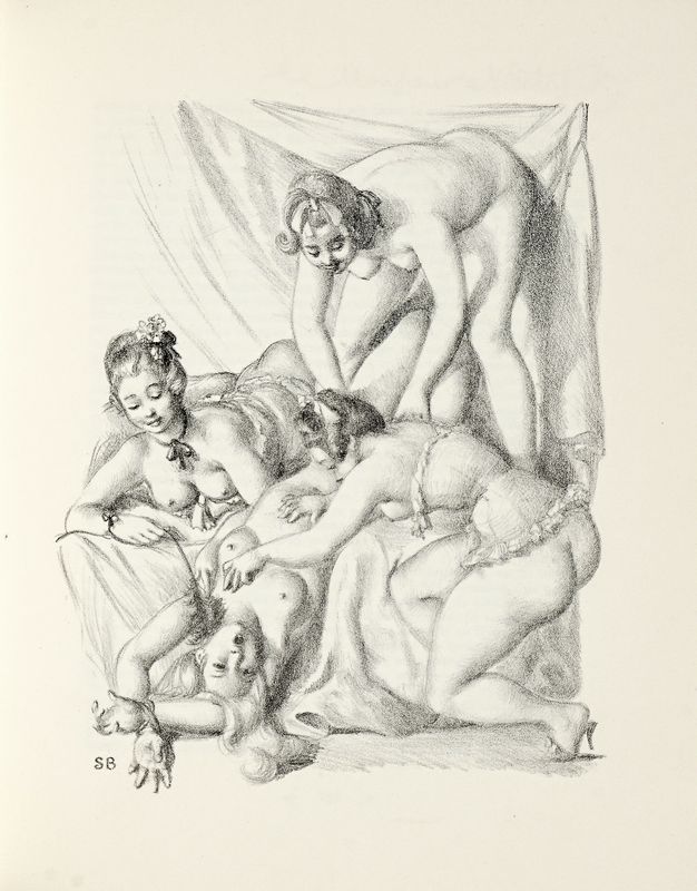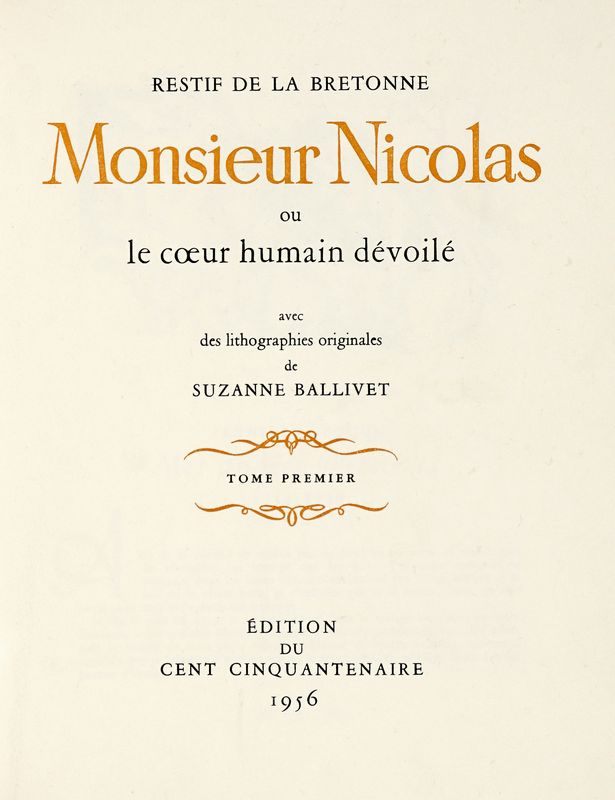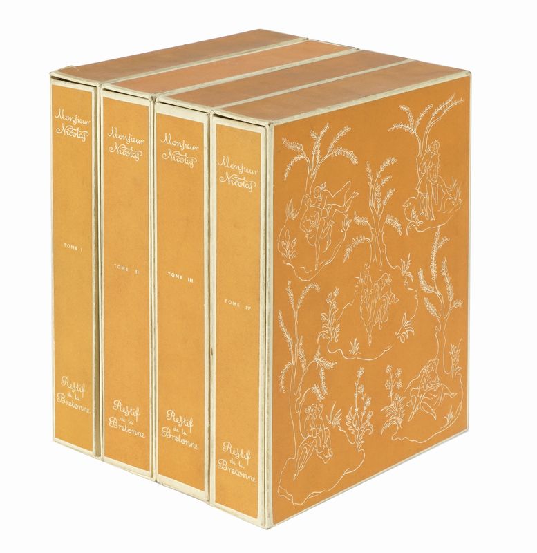 4 volumi in-8° (mm 235x185). Con, complessivamente, 48 litografie in bianco e nero a piena pagina fuori testo di Suzanne Ballivet, di cui 4 in antiporta, e numerose illustrazioni nel testo. Ottima copia parzialmente intonsa. Brossura editoriale con sovraccoperta con fregi e titoli al piatto; entro camicia e custodia coordinati in cartonato rigido arancione, decorati ai piatti e con titoli in bianco al dorso. Uno dei 410 esemplari numerati da 82 a 492, su una tiratura complessiva di 492 copie sur papier Velin du Marais.