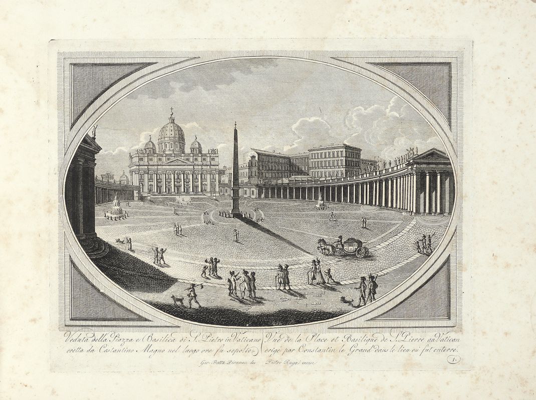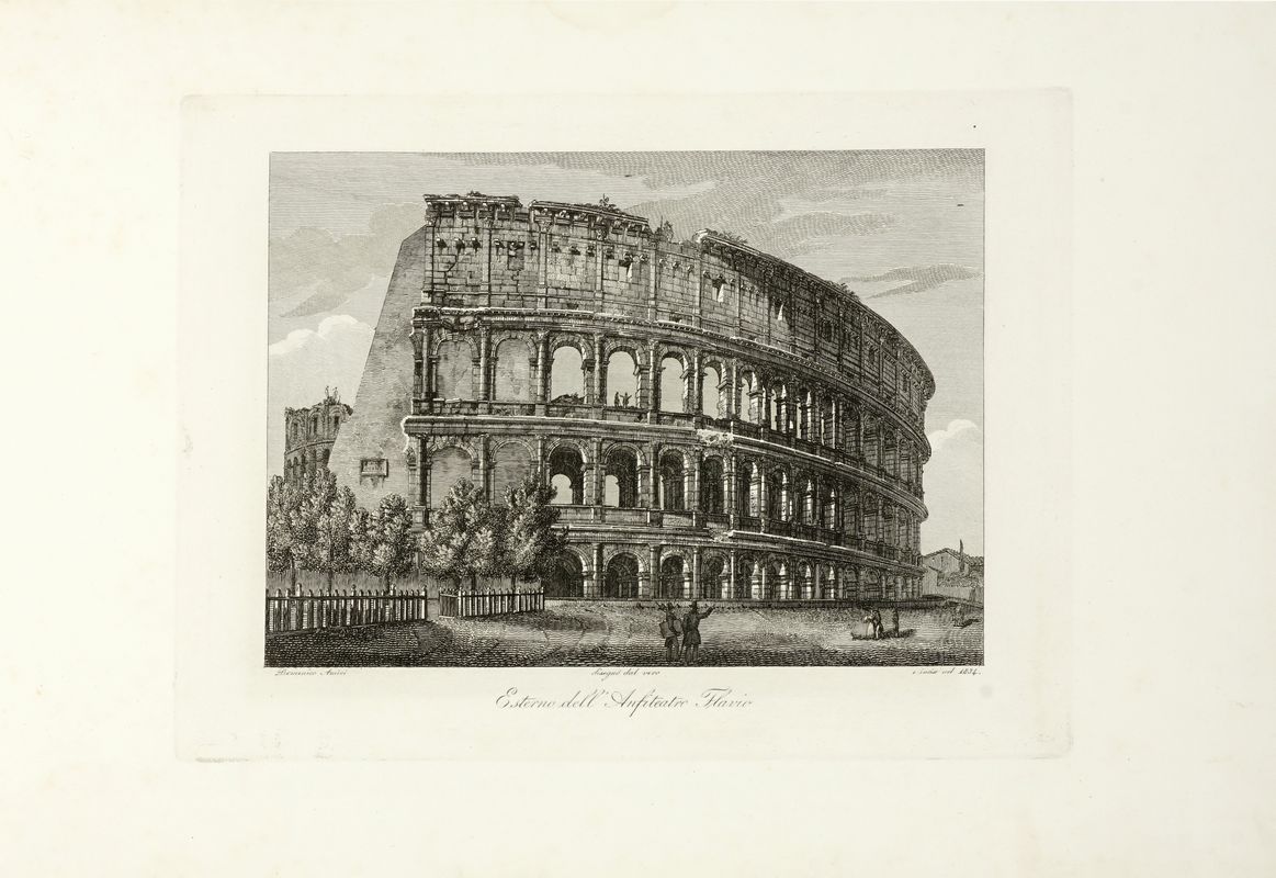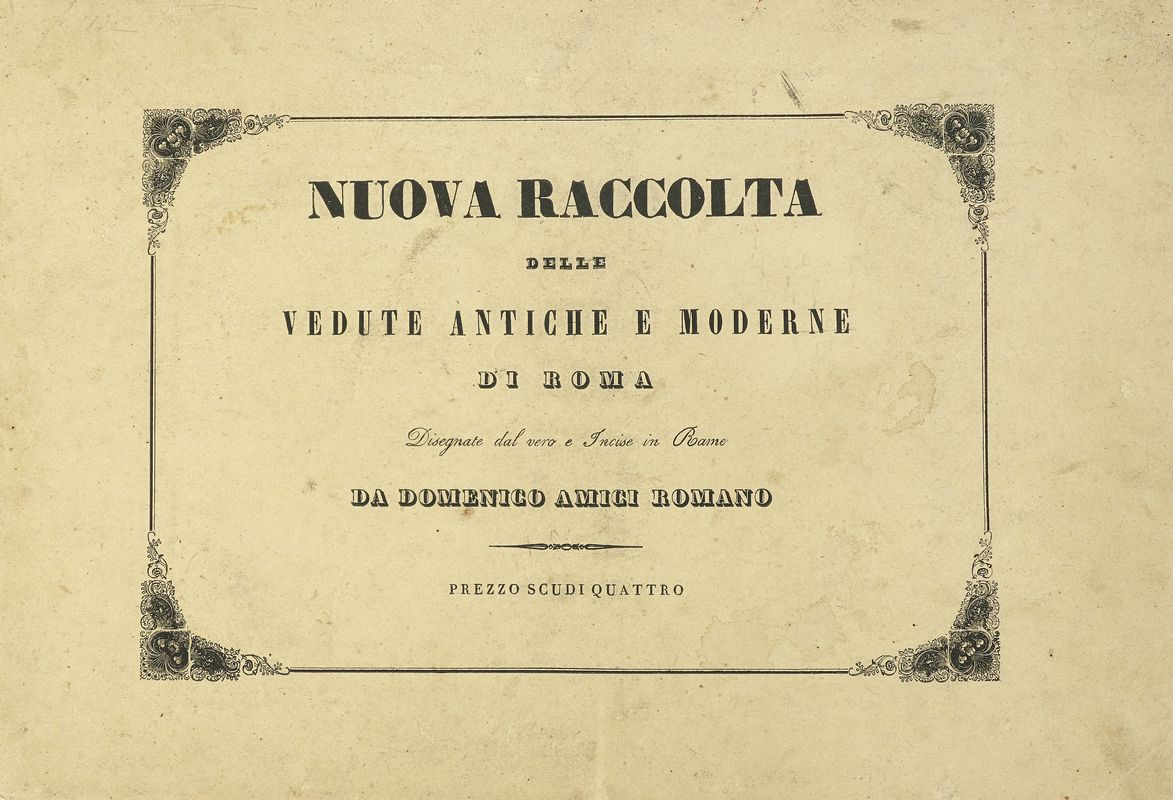 In folio oblungo (mm 305x460). Comprende 28 vedute di Roma e dintorni, alcune impresse su velina applicata. Parte delle carte con fioriture, gore in fine. Brossura editoriale originale con titoli impressi in nero conservata all'interno. Legatura moderna in piena pergamena rigida. SI AGGIUNGE: Nuova raccolta di 25 vedute antiche e moderne di Roma e sue vicinanze incise a bulino da celebri incisori. In folio oblungo (mm 272x375). Comprende un frontespizio inciso e 24 tavole incise su disegni di Piranesi, Roselli, Balestra e altri. Frontespizio con integrazione di carta, copia con fioriture e gore. Legatura in pieno cartonato decorato con mancanze lungo il dorso.