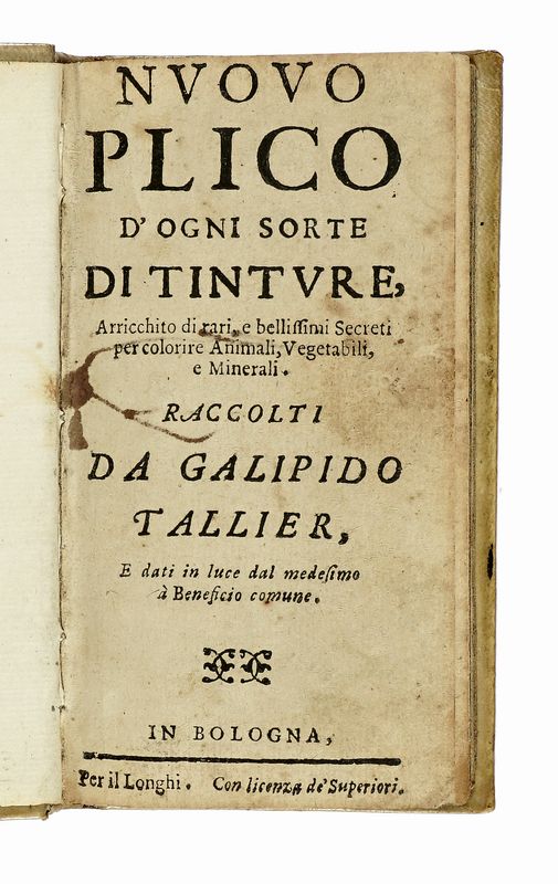 In-16° (mm 128x68). Pagine 189, 1 bianca. Privo dell'ultima carta bianca, una macchia d'inchiostro alle prime carte, leggermente corto di margini. Legatura coeva in piena pergamena rigida con titolo manoscritto al dorso. Tagli spruzzati in blu. Al contropiatto anteriore ex-libris di precedente collezione. Si vende con permesso di esportazione.