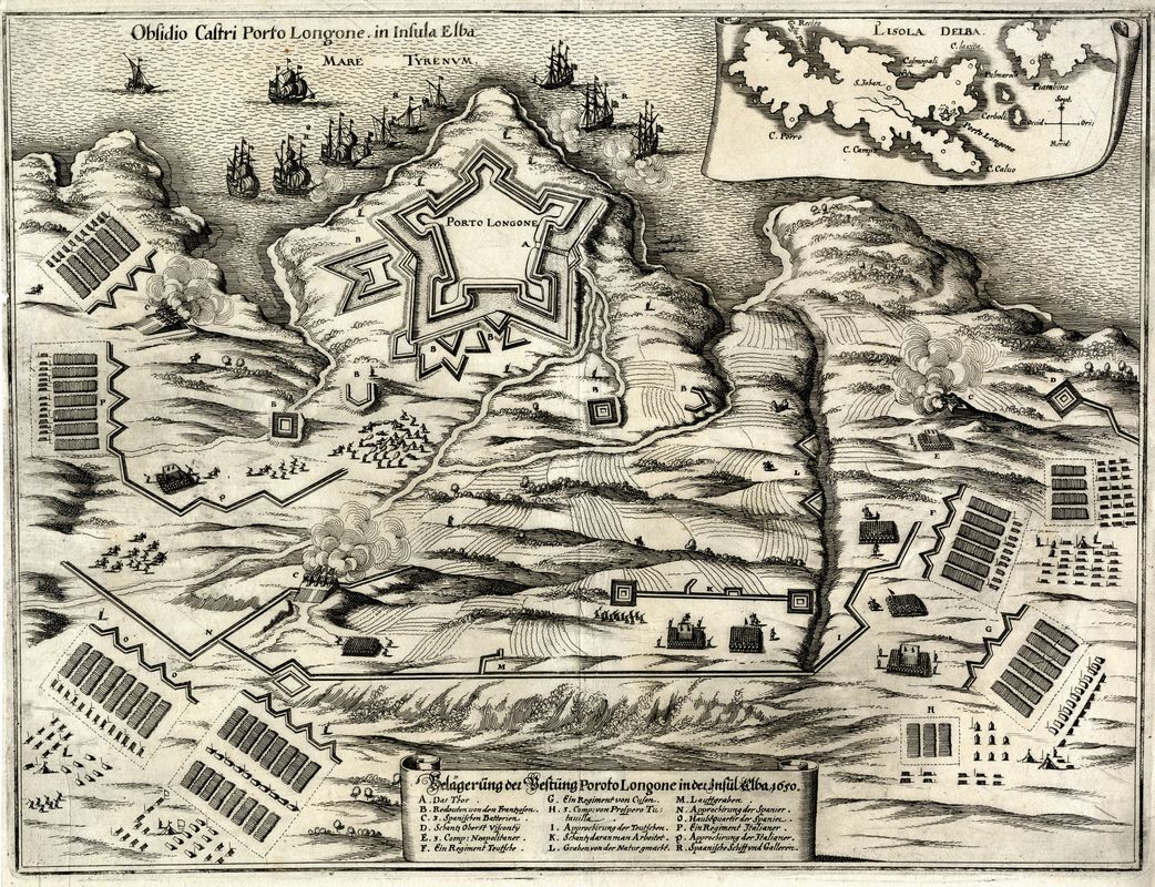 Acquaforte. mm 316x378. Mappa inizialmente apparsa in Neuwe Archontologia Cosmica di Johann Philip Zabelin (ovvero J.L.Gottfried) con tavole di Mattheus Merian. Il Neuwe Archontologia cosmica, Das ist Beschreibung aller Kayserthumben Königreichen und Republiken der gantzen Welt [...], viene edito a Francoforte nel 1638 e ristampato in lingua latina nel 1638 e nel 1649 e in lingua tedesca nel 1646 e nel 1695. Le stampe di Merian comparvero poi nel Theatrum Europaeum una sorta di giornale sulla storia della terra, in lingua tedesca, iniziato da Matthäus Merian e proseguito da altri editori, pubblicato tra il 1633 e il 1738 in 21 volumi. Veduta prospettica dell’assedio degli Spagnoli (maggio-agosto 1650) contro i Francesi che si erano impadroniti dell’Elba nell’ottobre 1646. In alto, entro cartiglio, cartina dell’Elba, in basso legenda con 17 richiami in tedesco relativi a luoghi e schieramenti di soldati e batterie sul territorio, la pianta della poderosa fortezza sulla punta e in mare la flotta assediante spagnola.