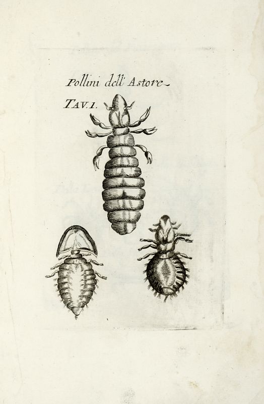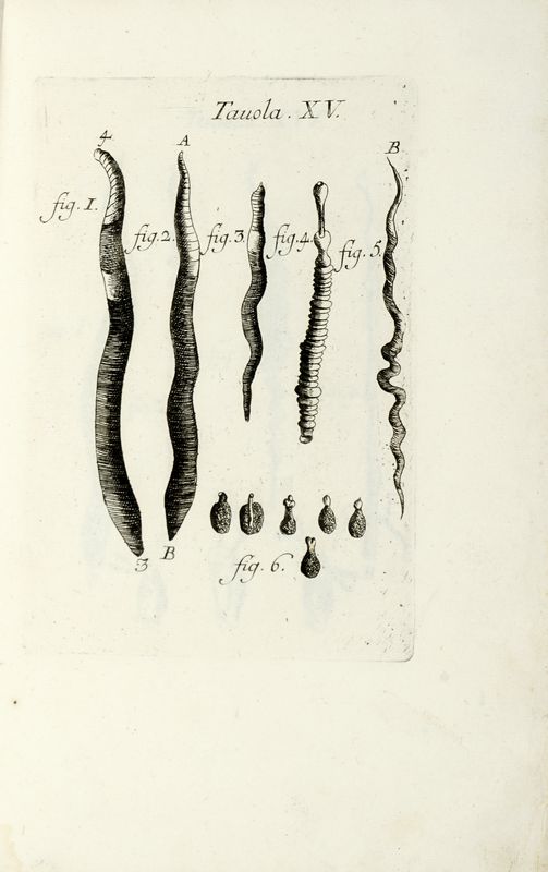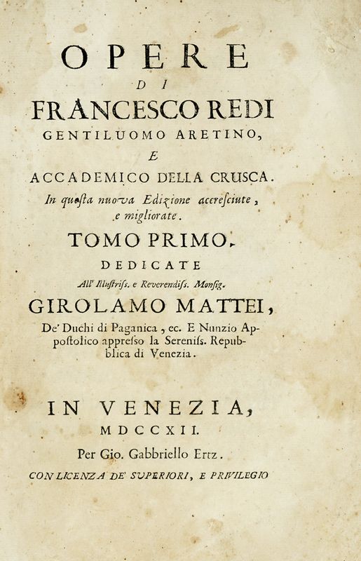 7 parti in 6 volumi in-8° (mm 224x145). Pagine 26 [i.e. 24], 39, [3], 204, 6 bianche, [2], 29 tavole fuori testo numerate I-29, 223, 1 bianca, 26 tavole fuori testo numerate I-XXVI; [8], 86, 2 bianche, 6 tavole fuori testo numerate 1-6, 302 con 1 tavola fuori testo; [4] di [8], 336, 151, [1]; 12, 310 [i.e. 312]; XIV [i.e. XVI], 216; [20], 224; 152. Primo volume allentato internamente, con i primi fascicoli parzialmente staccati. Assente la prima carta di occhietto, la carta bianca precedente la Vita di Francesco Redi, e il fascicolo Osservazione intorno a' pellicelli del corpo umano censito da OPAC. Annotato a penna blu e matita rossa da mano del XX secolo. Terzo volume fortemente gorato, con strappi e mancanze alla carta di frontespizio e macchie alla maggior parte dei fascicoli. Assenti due carte dal primo fascicolo (1 bianca e 1 contenete il frontespizio del Bacco in Toscana). Terzo volume con mancanze e strappi al fascicolo D (perdita di testo) e altri strappi a fine volume. Esemplare da studio, non passibile di restituzione.