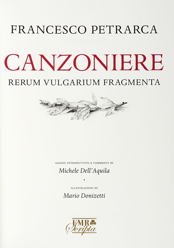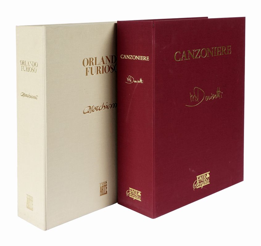 In-folio (mm 450x320). Con 10 tavole litoserigrafiche a colori di Elvio Marchionni. Legatura in piena pelle con titoli in oro al dorso con, al piatto anteriore, un esemplare dell'opera La battaglia sotto le mura di Parigi dell'Artista, litoserigrafia originale su lastra di ottone ricoperta in oro 24k. Entro cofanetto in piena tela beige, con titoli in oro al piatto e al dorso. SI AGGIUNGE: Petrarca Francesco, Canzoniere. Rerum vulgarium fragmenta [...]. Ilustrazioni di Mario Donizetti. Milano: Fmr - Scripta, 2004.