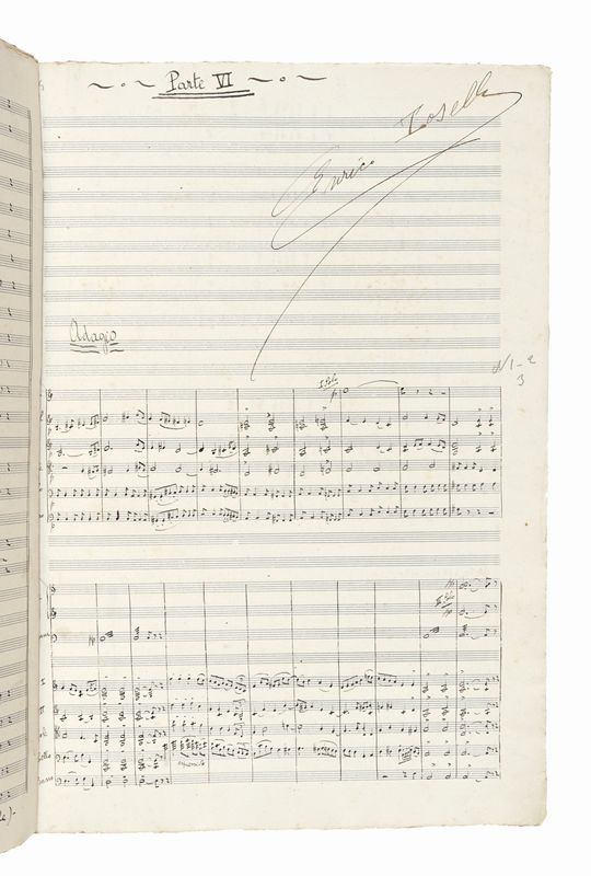 Manoscritto a inchiostro nero, rosso e matita grigia su carta pentagrammata. Organico orchestrale: Piccolo, Flauti, Oboi, Clarinetti in La, Fagotti, Corni in Fa, Trombe in Fa, Tromboni, Basso Tuba in Fa, Timpani, Arpa, Violino I-II, Viola, Cello, Basso. Composizione scritta su tre fascicoli (più volte firmati). Pagine dei tre fascicoli: 83, 64, 81. Alcune correzioni e cancellature nel testo. Dimensioni: 405x310 mm (fascicolo I e II) – 480x340 mm (fascicolo III).