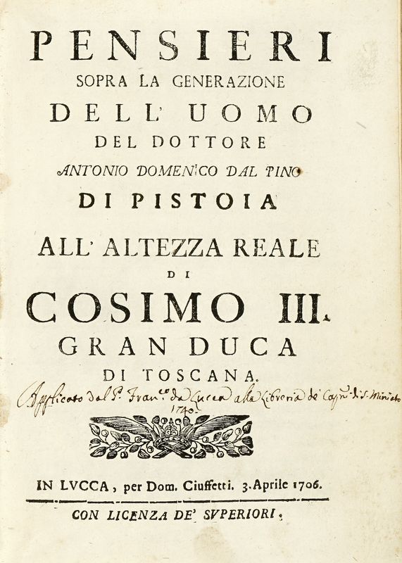 In-4° (mm 200x140). Pagine [8], 133, [3]. Fregio xilografico al frontespizio e testatine incise in legno nel testo. Ottimo esemplare, con piccole macchie ad alcune pagine. Legatura coeva in piena pergamena muta, con dorso a 4 nervetti. Lievi mancanze alle cuffie e al dorso. SI AGGIUNGE: Mauriceau Francois, Observations sur la grossesse et l'accouchement des femmes, et sur leurs maladies & celles des enfans nouveau-nez... A Paris: chez l'auteur, 1695. In-4° (mm 210x150). Legatura moderna in mezza pelle con punte e piatti in carta; titoli su tassello di carta al dorso a 4 nervi e sguardie rinnovate. Ex-libris di carta applicato al contropiatto.