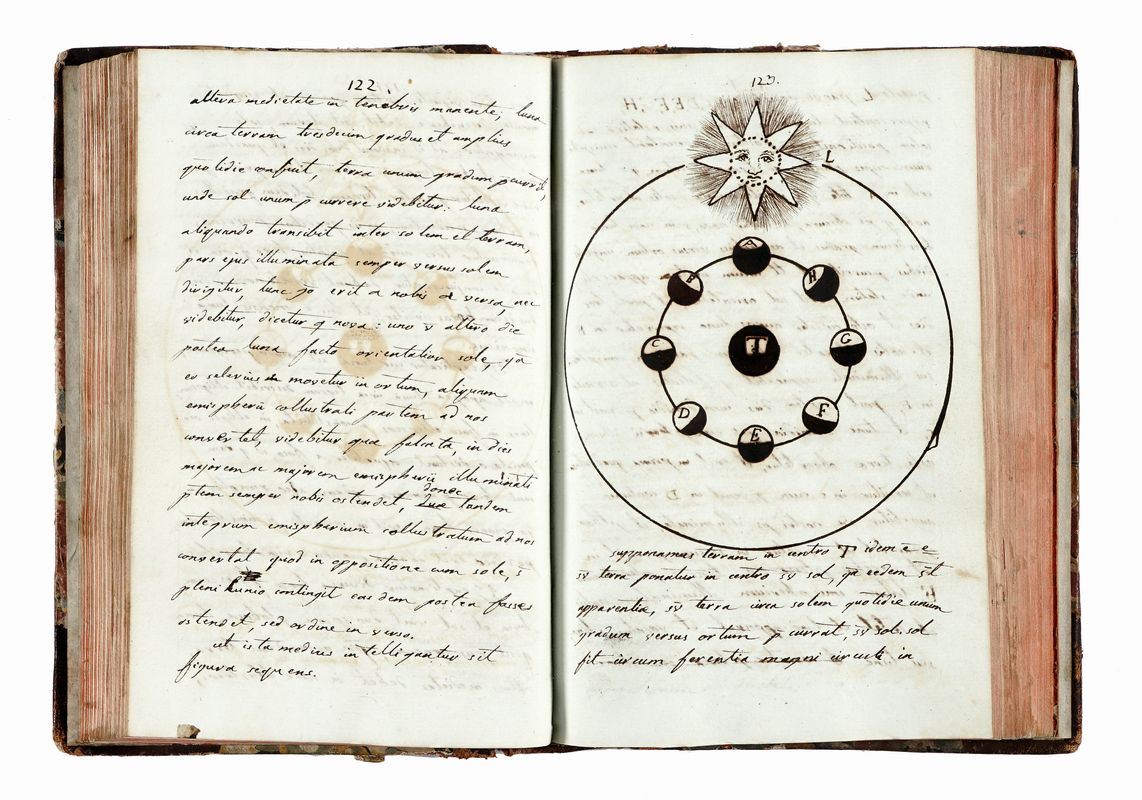 Manoscritto cartaceo a inchiostro nero. Tagli rossi. Carte lievemente azzurrine in ottimo stato. Pagine [4], 459, [5]. Testo in latino corsivo con alcune figure astronomiche dei pianeti e del sistema solare. Conservati sciolti nel volume alcuni disegni geometrici ed una piccola tavola sui moti della luna. Legatura coeva in mezza pelle con dorso a nervi e carta marmorizzata (con difetti). Ex libris And. Le Glay. Dimensioni 190 x 125 mm.