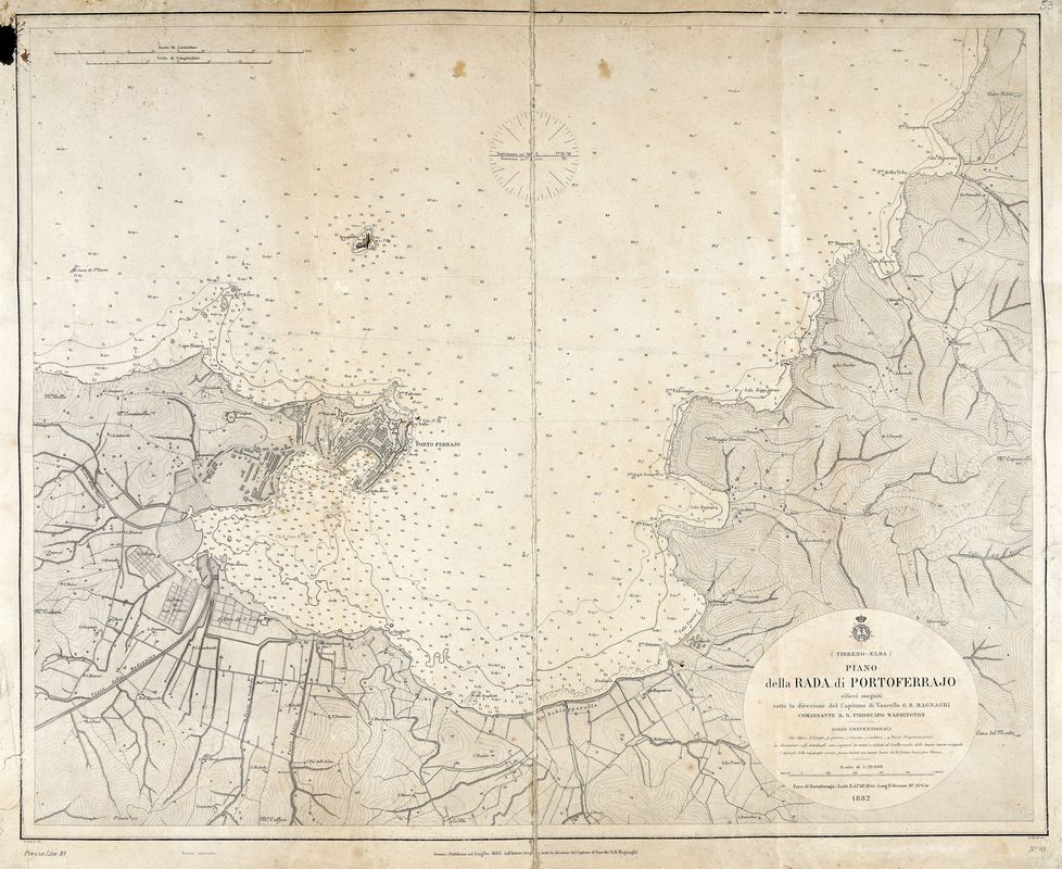 Litografia. mm 620x760. Al margine in basso a sinistra "T. Branchi dis." e a destra "P. Allodi inc." al centro "Genova, Pubblicato nel luglio 1883 dall’Istituto Idrografico…”, e “N°. 93”. In alto a sinistra scale di latitudine e longitudine. Dettagliata carta nautica e topografica della grande baia di Portoferraio da Punta Nisportino in alto a destra, fin oltre Capo Bianco a sinistra. Ben evidenziate la pianta della città con le sue fortezze, le saline di S. Pietro e S. Giovanni, le varie località ed edifici disseminati qua e là, le valli e i fossi, le isoipse, e in mare le isobate e le indicazioni di profondità. In basso a destra sono riportati il titolo, segni convenzionali, scale e data.