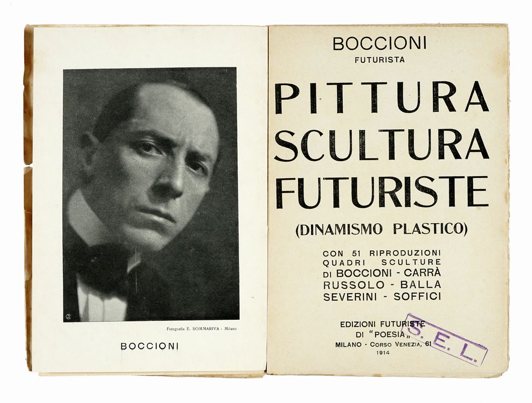 In-16° (mm 203x135). Pagine [8], 469, [5] con 1 ritratto fotografico di Boccioni in antiporta e 51 riproduzioni in bianco e nero di quadri e sculture su carta patinata. Bella opera in barbe, con leggere fioriture alla prima carta bianca. Brossura editoriale con titoli stampati in rosso e nero al dorso e al piatto anteriore. Fioriture a entrambi i piatti.