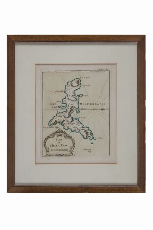 Incisione in rame, confini in coloritura. mm 230x180. Disegnata e incisa da J. Arrivet, tratta dall’opera di Jacques Nicolas Bellin Petit Atlas Français, Parigi, 1763 e ristampata l’anno successivo col titolo Petit Atlas Maritime (Tooley’s Dictionary of Mapmakers, 1979, p. 49). Carta geografica dell’Elba vista da est, quindi col versante ovest in alto e quello est in basso, bel cartiglio col titolo e la scala, punti cardinali a 16 direzioni. Presenta i contorni della costa in colorazione d’epoca, indicazione delle fortezze di “Port Ferare” e “Porto Longon” e pochi altri toponimi (alcuni dei quali decisamente approssimativi, come Campechio, Cap Hella e Colibitry, rispettivamente per Campo, Capo Stella e Capoliveri).
