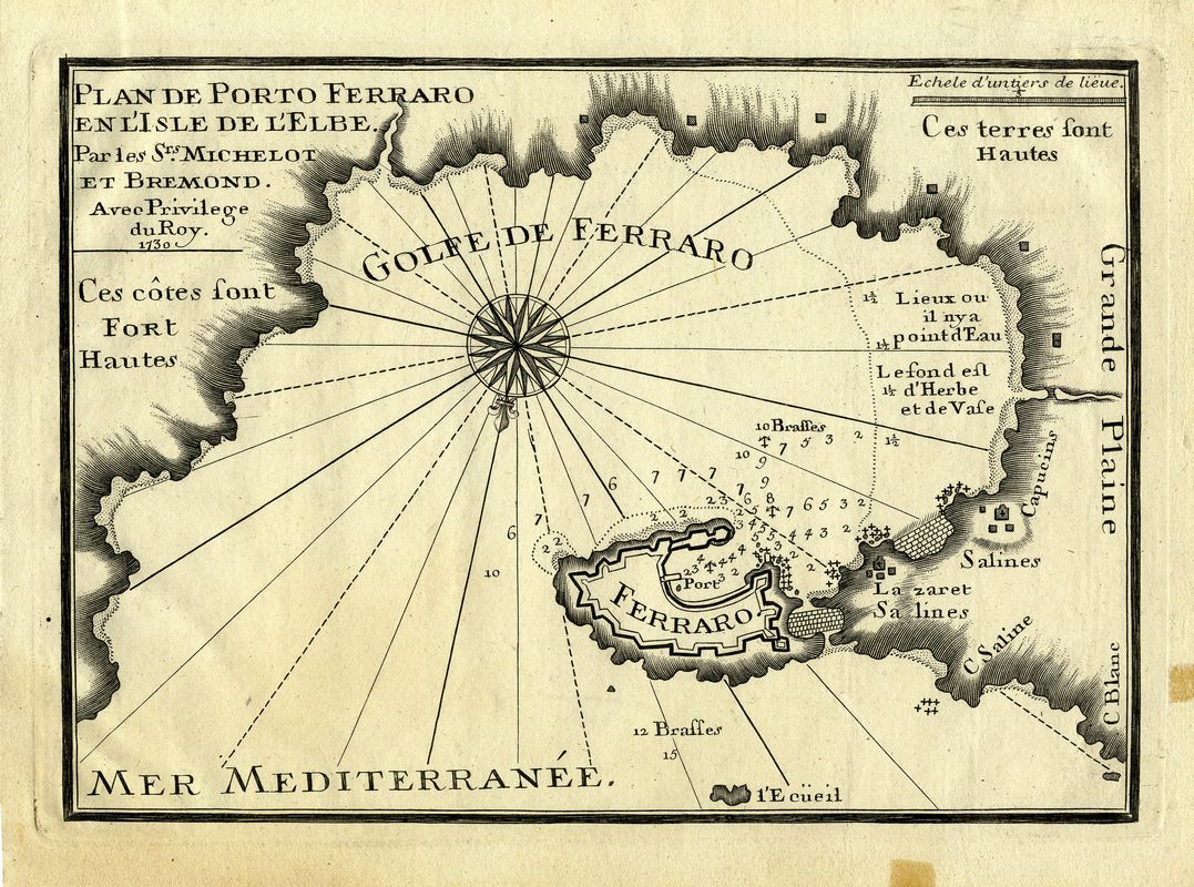 Incisione in rame. mm 187x268. Foglio: mm 221x291. Tratta da Recueil de plusieurs plans des ports et rades de la Mer Méditerranée. Dédiée à Monseigneur le Grand Prieur de France, Général des Galères. Levé et dessiné sur les lieux par les Srs Michelot Hydrographe et Pilote Real des Galères du Roy et Bremond Hydrographe du Roy et de la Ville, atlante nautico contenente le mappe dei maggiori porti del Mediterraneo. Dettagliata carta della rada di Portoferraio vista da nord, con la città fortificata, le indicazioni del lazzaretto, le saline, le profondità marine, il tipo dei fondali e quello della costa; al centro la rosa dei venti a 32 direzioni.