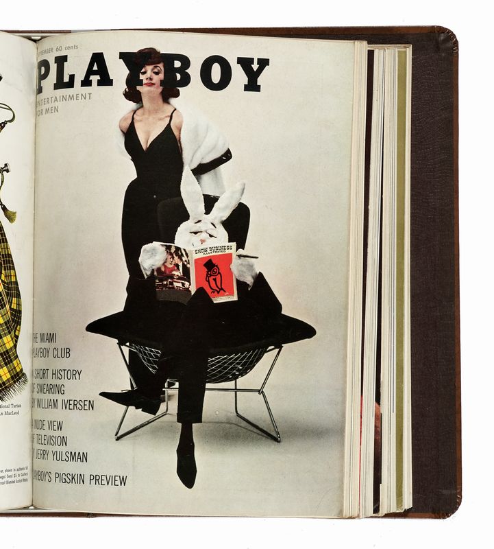 3 annate in 36 fascicoli in-4° (mm 280x221). Il lotto si compone delle annate complete del 1959-1961, dal gennaio del 1959 al dicembre del 1961, ciascuna composta da 12 fascicoli riccamente illustrati, contenenti ognuno la pagina tripla Playboy' s Playmate of the Month. Alcune pagine dell'annata del 1959 risultano slegate, ma ben conservate, o presentano sporadiche fioriture e pieghe, ma nel complesso ottimo stato di conservazione. Ciascuna entro raccoglitore originale in piena pelle, con logo e titolo in oro al piatto e al dorso; i fascicoli mantengono ciascuno la propria brossura originale illustrata a colori. Rari difetti alle brossure.