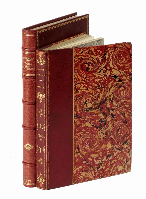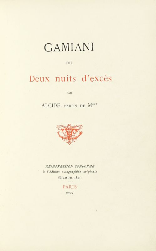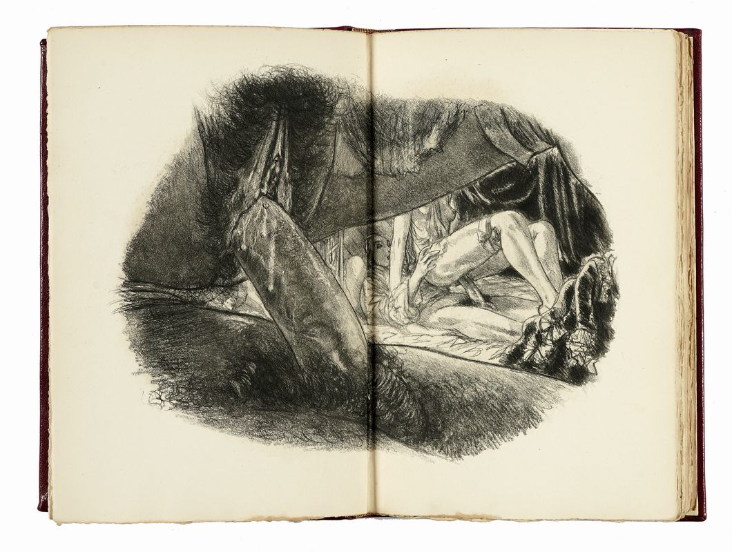 In-8° (mm 257x162). Con 1 antiporta fuori testo e 8 tavole a piena pagina nel testo, tutte protette da velina. Ottimo esemplare in barbe, con numerose illustrazioni in bianco e nero nel testo, anch'esse protette da velina. Legatura in piena pelle, con cornice dorata ai piatti, titoli in oro al dorso a 5 nervi e sguardie marmorizzate. Uno dei 100 esemplari numerati da 51 a 150 su grand vélin pur chiffon de lana a la forme, su una tiratura complessiva di 153. SI AGGIUNGE: De Musset Alfred, Gamiani ou deux nuits d’excès. Paris: s.e., 1905. In-8° (mm 227X145). Uno dei 300 esemplari su vélin à la forme, su una tiratura complessiva di 330 copie.
