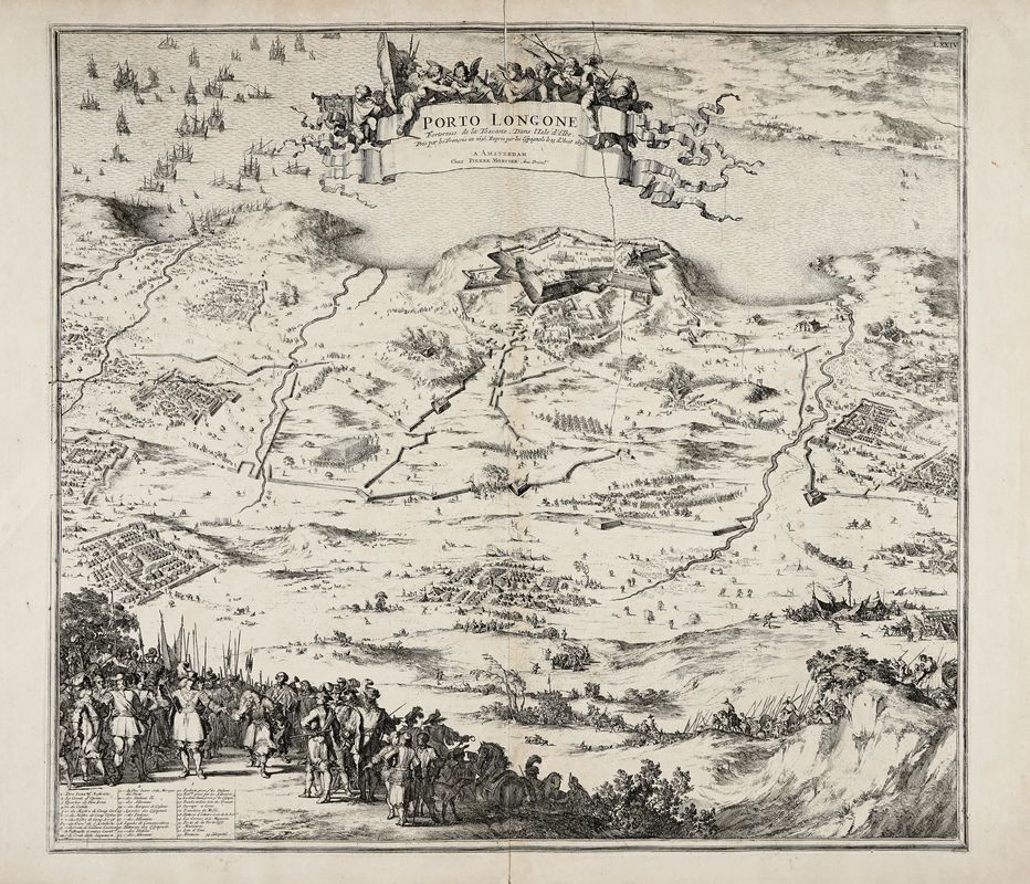 Incisione in rame. 520x575. Foglio: mm 565x665. Veduta di Porto Azzurro, come recita il cartiglio del titolo "presa dai Francesi nel 1646 e riconquistata dagli spagnoli il 15 agosto 1650". Da Nouveau theatre d'Italie, ou description exacte de ses villes, palais, Eglises, principaux edifices... pubblicato ad Amsterdam nel 1704/1705 e di nuovo nel 1724.