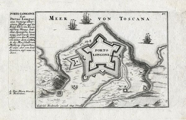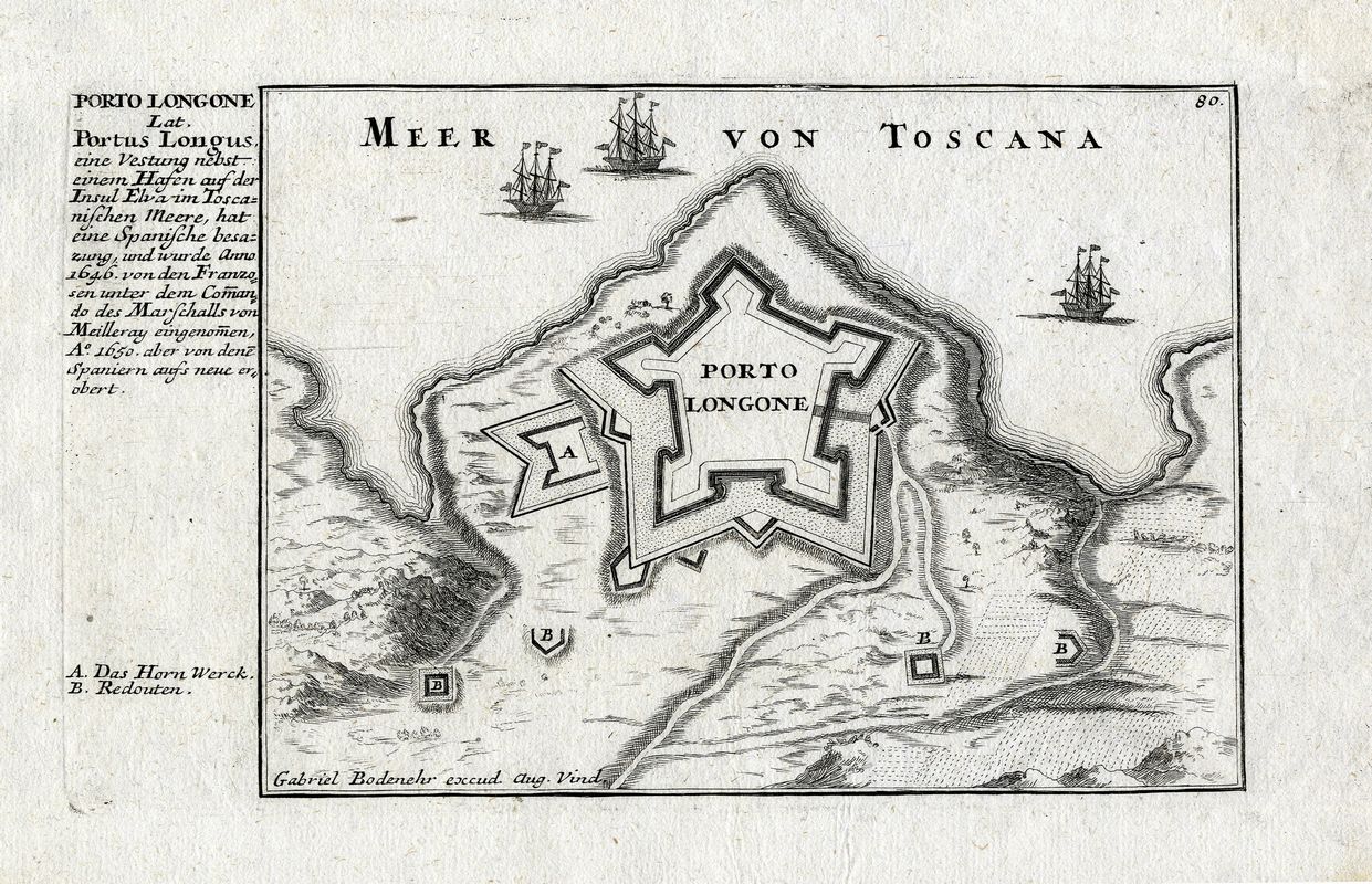 Incisione in rame. mm 140x260. Foglio: mm 200x310. Ottantesima tavola da Atlas Curieux oder Neuer und Compendieuser Atlas in welchem, ausser den General Land Charten von America, Africa, Asia und Europa, pubblicato per la prima volta da Bodenehr ad Augsburg nel 1704. Contiene 101 tavole numerate. Le tavole, numerate 1-101, comprendono: 98 carte geografiche, 97 su doppia pagina, 1 ripiegata, e 3 tabelle, 2 ripiegate e una su doppia pagina. SI AGGIUNGE: Thomas Salmon (Meppershall, 1679–1767), La Fortezza di Portolongone nello Stato de' Presidj. Incisione in rame. mm 125x180. Foglio: mm 147x198. Da Lo Stato Presente di tutti i Paesi e Popoli del Mondo..., In Venezia: presso Giambatista Albrizzi Q. Gir., 1738.