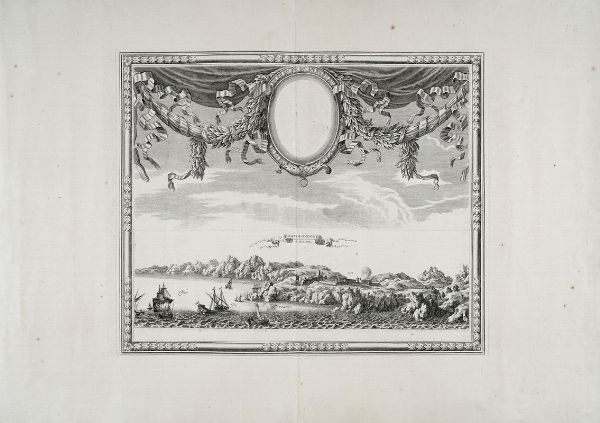 Acquaforte. mm 455x553. Foglio: mm 653x940. Sulla lastra in basso a destra "AD Perel Sc". Da un disegno di Sébastien Pontault de Beaulieu (1612-1674) ingegnere militare e disegnatore attivo sotto il regno di Louis XIII e di Louis XIV. La stampa è stata realizzata su tre lastre, una per la parte superiore con il medaglione, una per la parte in basso e una per l'elaborata cornice ornamentale. Il rame in basso (mm 165x500) raffigura la veduta di Portolongone presa dal mare, animata da galeoni, con le scogliere e la fortezza e in alto il titolo e la data "1646" (da riferire non all'esecuzione ma alla cattura del forte da parte dei Francesi). Il rame della parte superiore (mm 246 x 500), invece, è costituito semplicemente da un grande ovale centrale, senza ritratto, sostenuto ai lati da un enorme festone di alloro e nastri. Probabilmente l’incisione era stata preparata per glorificare Luigi XIV per l’impresa della conquista dell’Elba, poi rimasta incompiuta perché nel 1650 l’isola venne riconquistata dagli Spagnoli.
