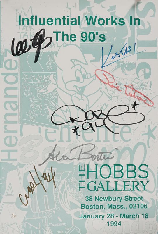 Poster originale della mostra collettiva del ’94: “Influential works in the 90’s”, con firme autografe di sei artisti; numerato 39/125. Perfetto stato. Dimensioni 410x610 mm.
