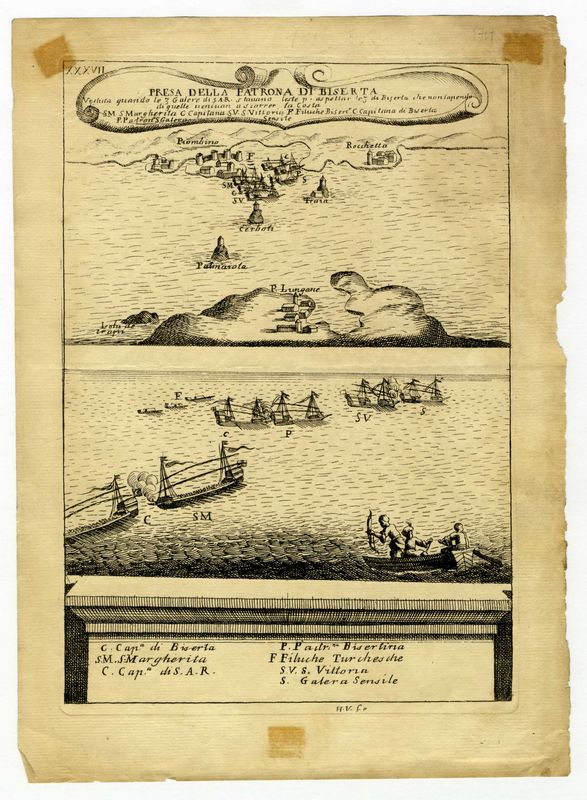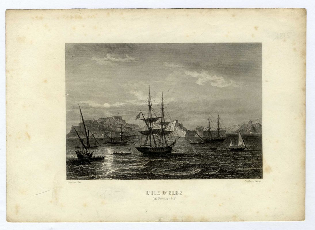 Acquaforte. mm 252x177. Foglio: mm 300x217. Tavola XXXVII tratta dall’opera di Fulvio Fontana, I pregi della Toscana nell’imprese più segnalate de Cavalieri di Santo Stefano, Firenze, Miccioni e Nestenus, 1701. La tavola raffigura una delle tante battaglie navali tra la flotta toscana e i Turchi che imperversavano nel Mediterraneo. Rame diviso in due parti: nella metà in alto vi è il titolo in cartiglio e la veduta della fortezza, nella parte bassa lo schieramento delle navi contraddistinte da lettere sciolte nella legenda. SI AGGIUNGONO: L’ILE D’ELBE (26 Février 1815). Sandoz del. Outhwaite sc. 1815. Incisione su acciaio. mm 115x145.Veduta di Portoferraio sullo sfondo, in rada alcune imbarcazioni con al centro il grosso veliero “Incostant” col quale Napoleone fuggirà dall’isola nel tardo pomeriggio del 26 febbraio 1815. / Ansicht von Porto-Ferrajo auf der Insul Elba / Ansicht von Jamestown auf der Insul S. Helena. 1815/1821. Incisione in rame in coloritura. mm 224x177. Vedute di Portoferraio e di Jamestown, i capoluoghi delle due isole ove fu esiliato Napoleone, impresse sullo stesso foglio. In alto le scritte "Verm. Gegenstaende. CCIII. - Melanget. CCIII.".