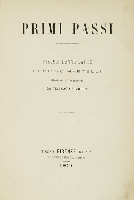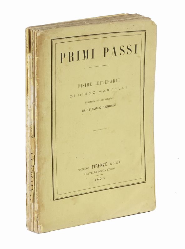 In-16° (mm 186x123). Pagine 202, [1], 1 bianca. Con 18 belle acqueforti di Telemaco Signorini applicate alle pagine. Alcune carte ondulate, altrimenti buona copia in barbe. Brossura editoriale in tutta carta gialla con titoli impressi in nero a piatti e dorso. Dorso lacunoso, opera parzialmente sfascicolata.
