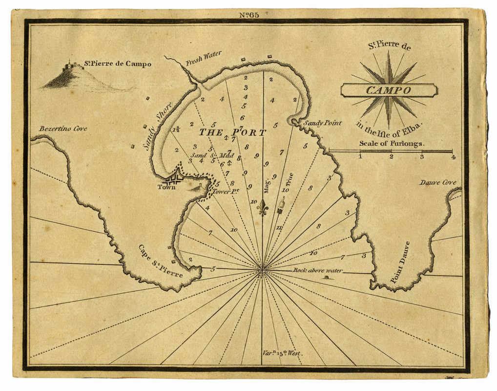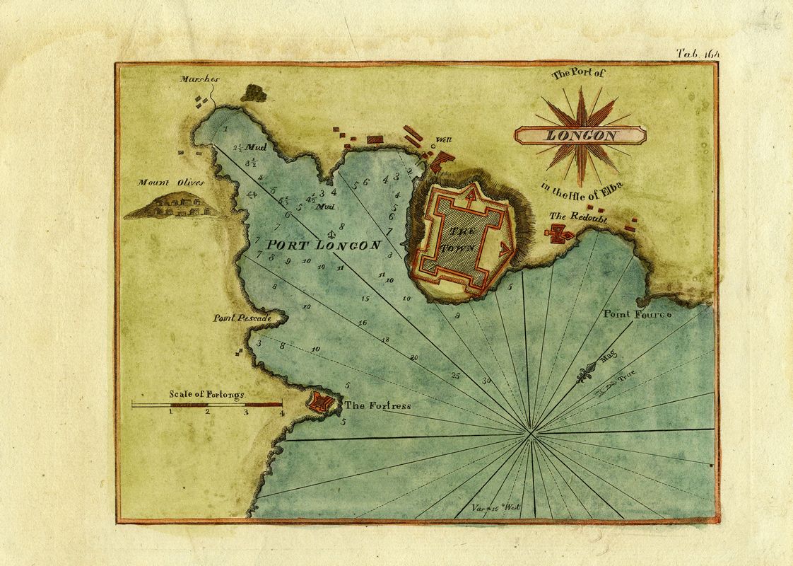 Incisione in rame. mm 150x185. Foglio: mm 155/175x198/243. Tavole 64 (Port of Ferraro), 65 (St. Pierre de Campo in the Isle of Elba) e 66 (The Port of Longon in the Isle of Elba, più un'edizione posteriore in coloritura di quest'ultima) siglate al margine inferiore a destra "J.S. sc" per John Stephenson, dal volume di Heather William, The New Mediterranean Harbour Pilot: Containing Two Hundred and Twenty-four Accurate Plans of the Principal Harbours, Bays, Roadsteads, and Islands in the Mediterranean Sea, Including Those in the Gulf of Venice, Archipelago, Sea of Marmora, & the Levant, pubblicato a Londra da J. W. Norie nel 1814.
