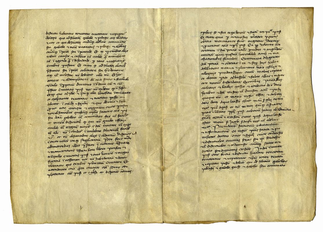 Manoscritti pergamenacei a inchiostro marrone scuro, azzurro e rosso. Testi in latino. Scrittura tarda carolina, cancelleresca, gotica (italiana e tedesca). Alcuni fogli sono stati anticamente recuperati da legature. Sono presenti difetti: alcuni brevi strappi, talvolta alcune mancanze e scoloritura dell’inchiostro (soprattutto al verso del foglio). Dimensioni varie.