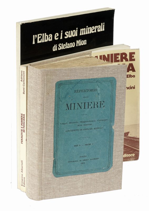 Compongono il lotto: 1) Osservazioni cristallografiche su l’ematite dell’isola d’Elba. Firenze: Tip. Galletti e Cocci, 1911; 2) Grattarola Giuseppe, Note mineralogiche. Roma: Tip. Barbera, 1876; 3) Grabau Enrico, Le miniere dell’Elba e l’industria del ferro in Italia. S.d.e. [i.e. Livorno: Tip. di Franc. Vigo, 1860]; 4) Targioni Tozzetti Giovanni, Minerali particolari dell’Isola dell’Elba ritrovati e raccolti dal signor Giovanni Ammannati… Firenze: dai torchi di Attilio Tofani, 1825; 5) Miniere e ferro dell'Elba dai tempi etruschi ai nostri giorni. Roma: Arti Grafiche Palombi, 1938.
