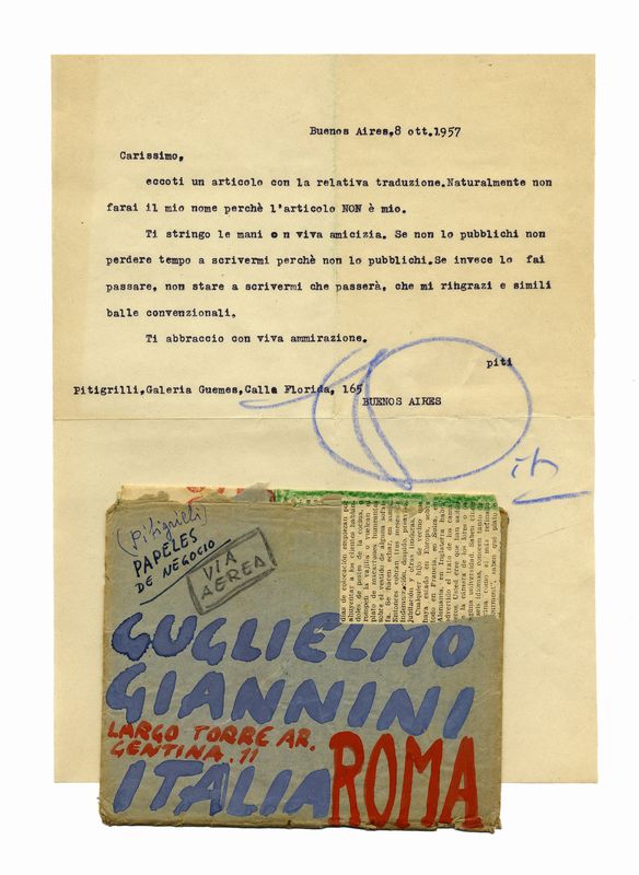 Manoscritti a inchiostro nero, rosso e blu. 2 lettere su carta intestata "Pitigrilli" e 1 "Pitigrilli Boulevard Montparnasse 169, Paris, 6". 1 busta conservata. Insieme anche le veline contenenti le risposte alle lettere di Pitigrilli. Dimensioni varie.