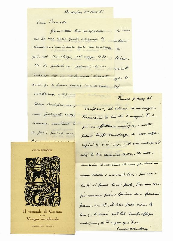 Manoscritti a inchiostro nero e blu. Il libro con dedica e firma autografa è “Carlo Betocchi. Il vetturale di Cosenza ovvero Viaggio Meridionale. Quaderni del Critone 1959”. Dimensioni varie.