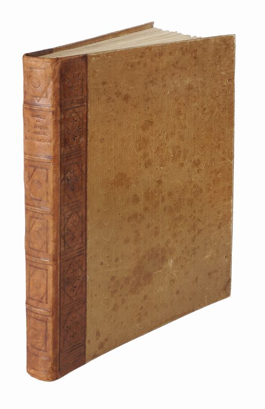 Formato atlantico (mm 495x355). Raccolta di 91 collotipie di dimensioni medie mm 357x253), ciascuna applicata per due lembi alla carta e recante al verso etichetta con numero del Canto e illustratore. Rare macchioline marginali, nel complesso ottimo stato. Legatura coeva in mezza pelle con piatti rivestiti in carta e titolo impresso in oro al dorso. Alla prima carta timbro della Raccolta Nannini di Modena.