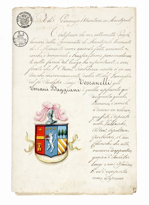 Manoscritti a inchiostro bruno. Alcune carte bollate. Un documento su carta intestata "I. E. R. Segreteria della Deputazione sul Regolamento della Nobiltà e Cittadinanza di Toscana". Alcune stemmi abbozzati a matita, altri parzialmente acquarellati, altri ancora terminati. Dimensioni varie.