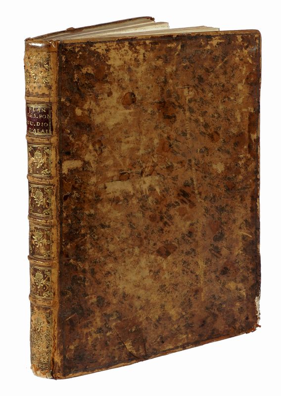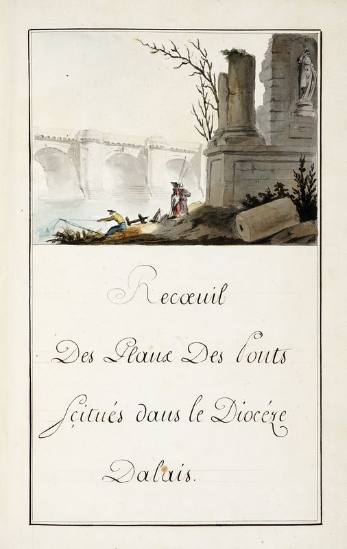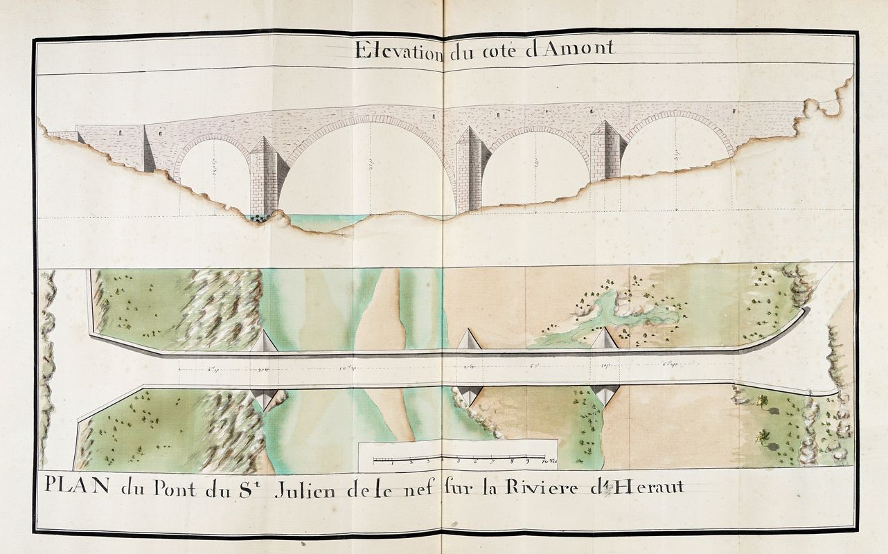 Manoscritto cartaceo in folio, relativo ai trentasei ponti che nel ‘700 attraversavano i fiumi della diocesi di Alès (Occitania, Francia meridionale). Testo in francese, corredato di grandi tavole acquerellate a colori, ripiegate, con le raffigurazioni dei ponti. Sia le pagine (41 scritte, 57 bianche) che le 36 tavole sono in perfetto stato. Legatura in piena pelle, con alcuni segni del tempo. Ex libris al piatto anteriore. Dimensioni 290 x 440 mm.