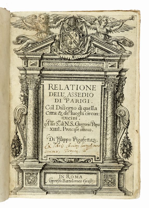 In-4° (mm 210x150). Pagine [4], 88. Bel frontespizio architettonico inciso. Gorate le prime carte (con macchia che itneressa le carte da A3 a E, leggermente rifilato al margine superiore, privo, come di consueto, della mappa ripiegata della città di Parigi. Legatura coeva in piena pergamena floscia con titolo manoscritto al dorso. Macchiati i piatti, ricostruita la cuffia inferiore. Nota di possesso manoscritta al frontespizio.