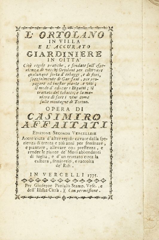 In-4° (mm 205x150). Pagine [12], 296 con 1 antiporta incisa in principio e 1 [di 2] tavole ripiegate fuori testo. Copia priva di una delle due tavole ripiegate, con fioriture alle carte. Legatura in pieno cartonato rustico con titolo manoscritto al dorso. SI AGGIUNGE: Affaitati Casimiro, L'ortolano in villa e l'accurato giardiniere in città. Vercelli: Giuseppe Panialis, 1775. 1 volume in-8° (mm 180x120). Scompleto delle illustrazioni.