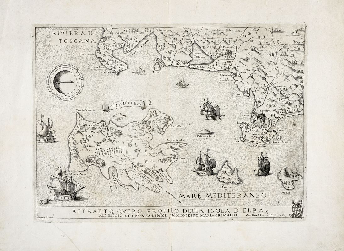 Incisione in rame. mm 315x434. Foglio: mm 418x573. Al margine inferiore a sinistra la firma "il Buono fec. e Forma", a destra stemma araldico. Non comune carta topografica dell’isola d’Elba dalla forma strana e fantasiosa. Sono evidenziate soprattutto le due città fortificate di "Cosmopoli" e "Porto Longone", nella cui profondissima insenatura si legge "Porto Longone Assediato alli 27 settembre et resosi a patti di buonaguerra /a Francesi li 29 ottobre 1646". Scarsi i toponimi di località e paesi; da segnalare nella parte centro-orientale dell’isola la presenza di uomini con lance o bastoni, e in quella occidentale due fitte boscaglie e coltivazioni ben ordinate, forse vigneti. Intorno all’isola, sormontata da cartiglio nastriforme col titolo, alcune isole dell’arcipelago toscano (Troia, Palmarola, Giglio e Giannutri), rosa dei venti e alcuni grossi velieri. Nella parte alta della carta a sinistra la scritta "RIVIERA DI TOSCANA" con la costa disegnata da S. Vincenzo all’Argentario, con i principali paesi e città, orografia, qualche fiume e radi alberi.